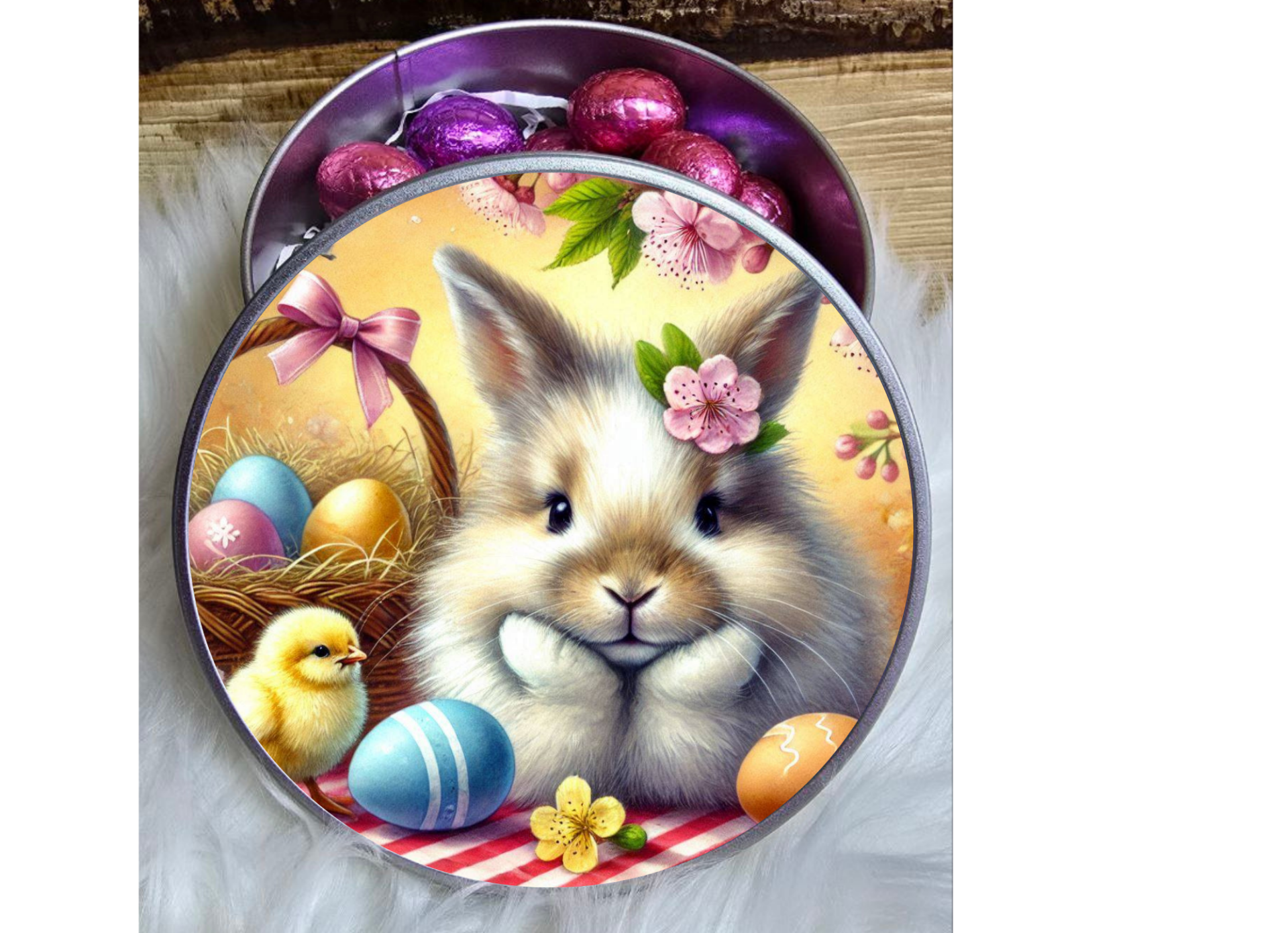 Vrolijke paas snoeptrommel. Deze kan ook gevuld gekocht worden met 200gr paaseitjes. Ben je opzoek naar het perfecte Paascadeau? Ontdek onze unieke snoeptrommels met een vrolijke paasafbeelding en of gevuld met overheerlijke chocolade paaseitjes. Onze gesublimeerde snoeptrommel met een diameter van 12 cm en 6cm hoog is ideaal voor jong en oud.
