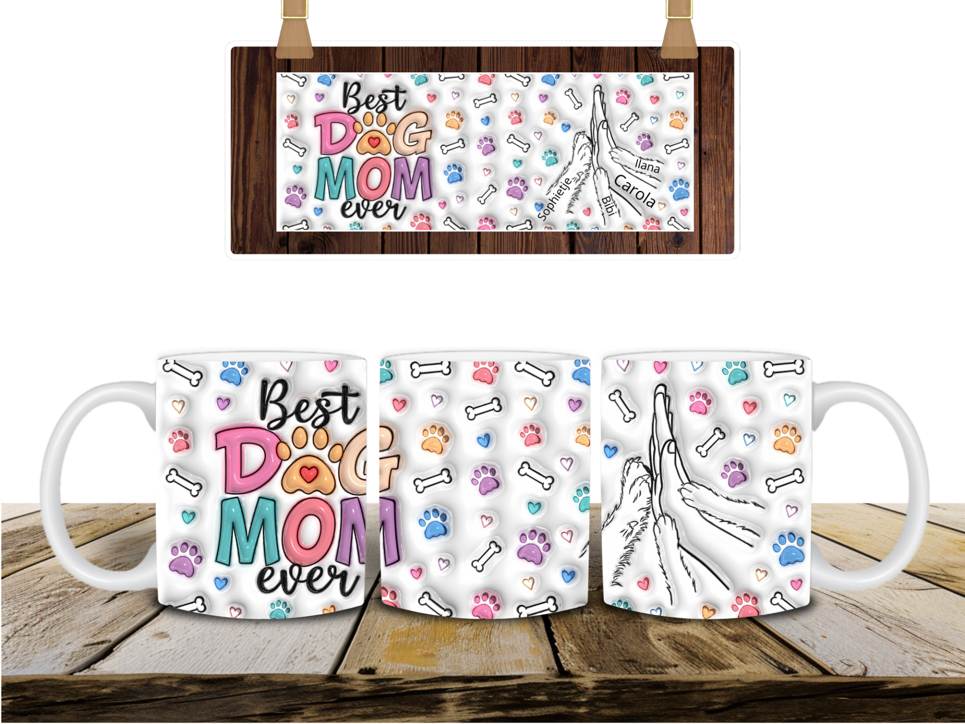 Deze mok is speciaal voor de hondenmama. De mok is te personaliseren met eigen naam en van 1 tot 4 honden namen.