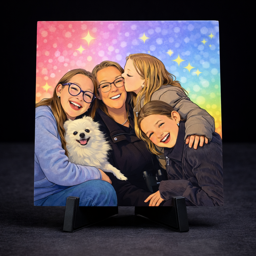 Verras jezelf of iemand anders met een persoonlijk cartoon tegeltje van 11 x 11 cm. Stuur eenvoudig een foto van een persoon of meerdere personen, en ik zet deze om in een speelse cartoonillustratie met een zachte, overlopende achtergrondkleur.